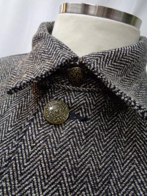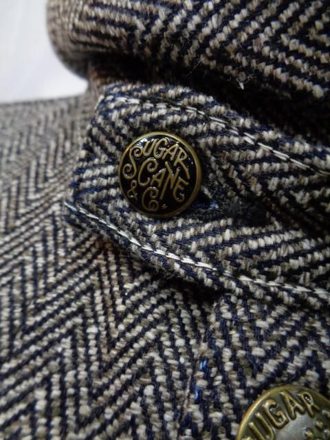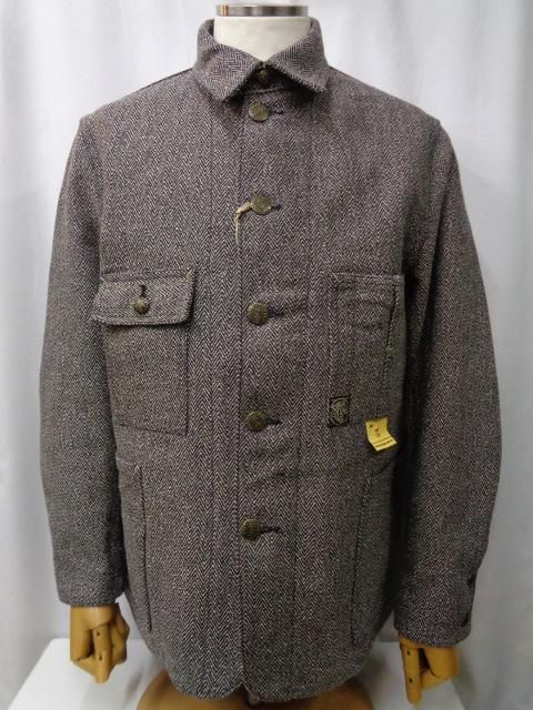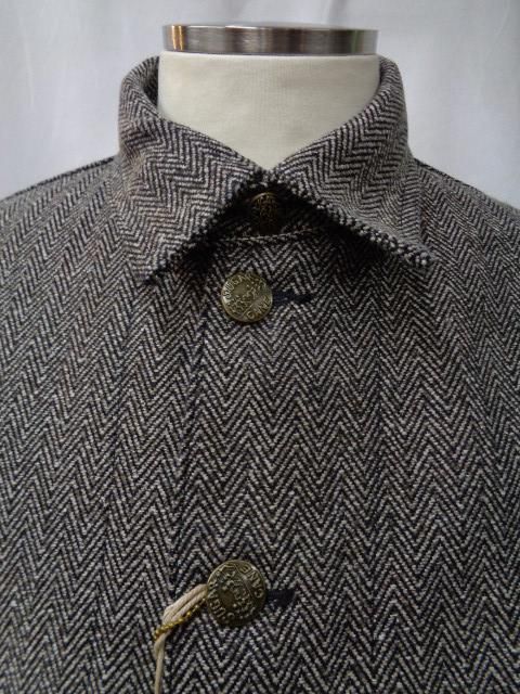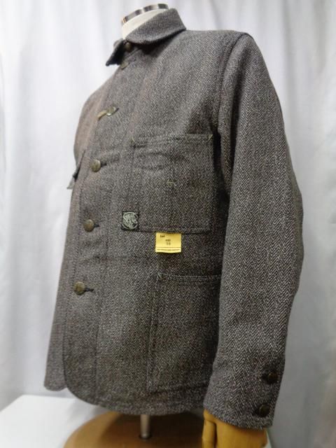 経糸が8番手のロープインディゴ、緯糸が12番手のベージュとブラウンの2色のネップ糸を撚って織り上げた16.7オンスのインディゴツイード。経年変化の楽しみなクラシカルなコットンへリンボーンに仕上がっている。型は1930年代のヘッドライトのワークコートがベース。チンストラップ付きの台襟、大戦前のチェンジボタンや左胸の3in1ポケット、アジャスタブルカフなど、こだわりのディテールの詰まった黄金期の仕様となっている。